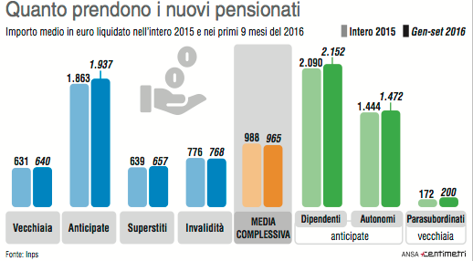 Nel 3o trimestre, secondo il monitoraggio sui flussi di pensionamento dell'Inps pubblicato ieri, la tendenza si è attenua- ta (era -34% tendenziale nel primo semestre) poiché nella seconda parte dell'anno una parte di coloro che erano rimasti bloccati (4 mesi in più per tutti, passaggio complessivo da 63,9 anni a 65,7 per la vecchiaia delle donne) è riuscito ad uscire. Il calo più consistente si è registrato, grazie all'aumento dell'età di pensionamento, sulle pensioni di vecchiaia (da 161.528dell'intero2015a77.755 nei primi 9 mesi del 2016) e su quelle anticipate (da 157.052 a 73.289). Il calo dell'incidenza degli assegni di anzianità generalmente più "pesanti" ha fatto sì che sia diminuito l'importo medio degli assegni complessivi (da 988 euro al mese a 965). Gli importi comunque variano notevolmente sia tra le varie categorie (dai 640 euro medi per la vecchiaia ai 1.937 medi delle pensioni anticipate) sia tra le gestioni (dai 184 euro medi per i parasubordinati a 1.191 dei lavoratori dipendenti).Le pensioni liquidate dal fondo lavoratori dipendenti nei primi nove mesi del 2016 sono state 180.221 a fronte delle 236.134 dei primi nove mesi del 2015 (-23,6%). Gli assegni liquidati ai coltivatori diretti sono stati 20.006 a fronte dei 28.304 nello stesso periodo del 2015 (- 29,3%) mentre quelle liquidate agli artigiani sono stati 38.667 a fronte dei 55.205 dello stesso periodo del 2015 (-29,9%). Si registra un calo più consistente nell'intero periodo per i nuovi assegni sociali liquidati, da 36.455 a 23.715 a causa, spiega l'Inps, dell'aumento di quattro mesi dell'età minima, cresciuta a inizio 2016 da 65 anni e tre mesi a 65 anni e sette mesi. Grazie all'aumento dei requisiti per il pensionamento, l'età media al momento della liquidazione dell'assegno è stata per i lavoratori dipendenti, di 65,3 anni per la pensione di vecchiaia e di 60,4 anni per la pensione anticipata a fronte di valori per l'intero 2015 rispettivamente di 65,1 anni per la vecchiaia e 59,9 anni per l'anticipata.