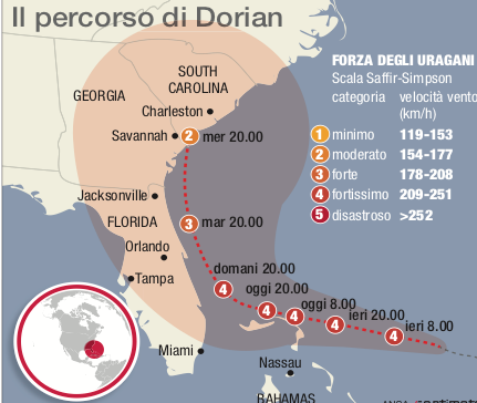 NEW YORK. Milioni di americani nella morsa di Dorian. L’uragano di categoria 4 continua a rafforzarsi e minaccia non solo la Florida ma anche la Georgia e il North e South Carolina. Nei quattro stati i preparativi procedono a ritmo serrato in attesa di conoscere ulteriori dettagli sulla traiettoria del mostro Dorian, il cui impatto con la terra potrebbe essere catastrofico. Al momento la Florida sembra poter tirare un sospiro di sollievo visto che le ultime rilevazioni segnalano una virata verso est dell’uragano. Dorian potrebbe quindi solo lambire la costa atlantica dello stato senza però scaricarvi tutta la sua furia. Le autorità mantegono comunque alta l’allerta e chiedono ai residenti di fare lo stesso. “Restate vigili” dice il governatore Ron DeSantis, mettendo in evidenza che, pur forse scampando a un impatto diretto, la Florida sperimenterà lo stesso piogge e venti violenti, e probabili inondazioni in diverse aree. “Venti devastanti e aumento dei livelli dell’acqua sono ancora possibili” avverte il National Hurricane Center. Per i meteorologici Dorian si sta rivelando una sfida particolarmente difficile vista la sua imprevedibilità di movimento. E proprio per questo l’allerta: la situazione potrebbe infatti cambiare in meglio o in peggio nel giro di poco, già al prossimo bollettino di aggiornamento. A prepararsi al peggio sono ora la Georgia e il North e South Carolina, che ha già dichiarato lo stato di emergenza in vista di Dorian. L’allarme è alto per le zone costiere, le più esposte. E i residenti iniziano ad attrezzarsi, sospendendo il fine settimana lungo del Labor Day. Fra le poche certezze di Dorian ci sono al momento le Bahamas. Le isole non scamperanno alla furia dell’uragano categoria 4. “Produrrà risultati catastrofici” mette in guardia il capitano Stephen Russell, direttore della Bahamas National Emergency Management Agency, invitando i residenti a prepararsi a diversi giorni di venti devastanti e di acqua alta. Dorian infatti si muove lentamente e questo lo rende ancora più pericoloso perché vuol dire che le sue piogge dureranno a lungo. Donald Trump segue gli sviluppi da Camp David, da dove ha raggiunto in elicottero il campo da golf del Trump National di Sterling. Trump per seguire Dorian ha cancellato il suo viaggio in Polonia memore delle critiche per la gestione dell’uragano Maria. Il presidente ha voluto così voluto evitare di esporsi a critiche data anche l’importanza della Florida nella mappa elettorale: vincere nello stato potrebbe infatti spianargli la strada alla rielezione. L’obiettivo di Trump è evitare anche il ripetere di quanto accaduto a George H. W. Bush e George W. Bush, tutti e due usciti dalla Casa Bianca poco dopo gli uragani Andrew in Florida e Katrina a New Orleans.