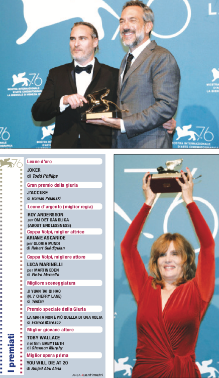 VENEZIA. Il Leone d’oro a Joker di Todd Phillips con l’ovazione al protagonista Joaquin Phoenix, il secondo premio al grande assente Roman Polanski per J’Accuse, l’Italia che vince due premi, con Luca Marinelli per Martin Eden e La mafia non è più quella di una volta di Franco Maresco cui è andato il premio speciale della giuria e soprattutto il cinema che abbraccia e quasi prende sulle spalle i problemi del mondo diventando baluardo di libertà e di diritti umani. E’ la fotografia finale di Venezia 76 davanti ad una platea di cineasti che parlano tutte le lingue del mondo, vengono dal Sudan e dal Brasile, da Hong Kong e dall’Australia, dalla Nigeria, dal Pakistan, dall’Ucraina perchè al di là delle parole ad unirli è una sola lingua universale, quella del cinema e del racconto per immagini. Poco prima della cerimonia, per sette ore, il red carpet era stato occupato da oltre 300 attivisti per il clima che hanno cercato (e trovato) attenzione per il tema delle Grandi Navi in laguna. “Devo questo premio anche a Jack London, che ha creato la figura di Martin Eden, un marinaio. E perciò dedico questo premio a coloro che sono in mare a salvare altri esseri umani che fuggono e che ci evitano di fare una figura pessima con il prossimo. Viva l’umanità e viva l’amore” ha detto con teatrale passione Luca Marinelli, il talento italiano che film dopo film sta costruendo una solida carriera premiata con la Coppa Volpi maschile. Poco dopo sul palco è salita la minuta fortissima Ariane Ascaride, l’attrice che in coppia con il marito regista Robert Guédiguian da’ vita ad una madre dolorosa e generosa, una roccia in Gloria Mundi, premiata anche lei con la Coppa Volpi. “Sono figlia di emigrati italiani fuggiti per la miseria e sono nata a Marsiglia, sono figlia di stranieri e sono francese ed è importante avere più culture possibili per vivere nel mondo. Questa coppa mi ricongiunge alle mie radici - ha detto in italiano - dedico questo premio a tutti quelli che hanno l’eternità nel fondo del Mediterraneo”. Il filo rosso della libertà, della difesa dei diritti umani ha unito tutti i commenti dei vincitori. “No a qualsiasi tipo di censura” ha detto il produttore di Maresco Rean Mazzone soddisfatto per il pre- mio ad un film che aveva creato qualche imbarazzo e poco prima abbasso la censura aveva detto la brasiliana Barbara Paz, premiata a Venezia Classici per il miglior documentario Babenco Tell Me When I Die. Il giovane regista sudanese Amjad Abu Alala leone del futuro con l’opera prima You Will Die at 20 ha raccontato come il suo paese non ha soldi per finanziare il cinema ma che ce ne sarebbe bisogno per raccontare cosa accade lì ora che c’è un nuovo governo in cui si spera, l’americana Celine Tricart, premio a Venice Virtual Reality ha spiegato come la sua opera immersiva, The Key, sia collegata alla chiave della casa d’origine che i rifugiati continuano a custodire nel corso della loro diaspora, Valentyn Vasyanovych, miglior film a Orizzonti con Atlantis ha collegato con entusiasmo la sua vittoria alla liberazione proprio ieri del regista Oleg Sentsov, arrestato e imprigionato in Russia per motivi politici e ora rilasciato in uno scambio di prigionieri. E più tenero di tutti il 71enne Yon- fan, il regista di Hong Kong che Con n.7 Cherry Lane ha vinto per la migliore sceneggiatura, che ha raccontato la storia del suo paese, minacciato nei diritti umani più volte nei decenni, augurandosi che “Hong Kong sarà libera ancora”. In un contesto così ‘politico’ il commento della presidente di giuria, l’argentina Lucrecia Martel è sembrato la sintesi più opportuna: “Questi registi ci hanno fatto pensare a cosa accade nel mondo ed è la funzione del cinema, comunicare. Abbiamo bisogno di parlare e dialogare”. I volti felici della finale di Venezia 76 sono quelli di Toby Wallace, il talentuoso attore di Babyteeth, del giurato italiano Paolo Virzì che ha abbracciato Luca Marinelli sul palco, fiero di aver fatto un buon lavoro anche per l’Ita- lia, del produttore di Polanski Luca Barbareschi, del Leone d’oro Todd Phillips che ha abbracciato il suo coraggioso protagonista “dall’anima bella” Joaquin Phoenix maschera di Joker. Un momento finale di emozione per il presidente uscente della Biennale Paolo Baratta davanti alla platea in cui sedeva tra gli altri il ministro per i Beni Culturali Dario Franceschini. Con The Burn Orange Heresy di Giuseppe Capotondi si è concluso il festival, ospite di riguardo Mick Jagger, per una volta attore.